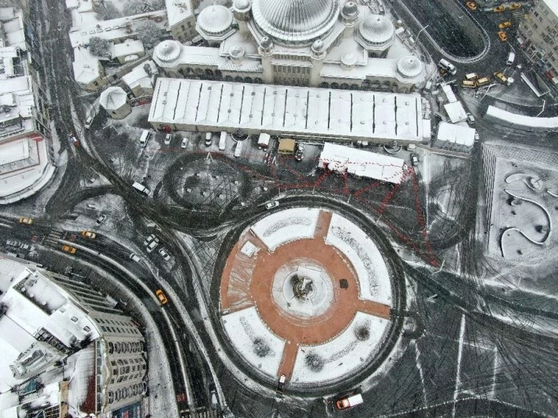 İstanbul’da dün akşam saatlerinden beri etkili olan kar yağışı nedeniyle beyaza bürünen Taksim Meydanı havadan görüntülendi.