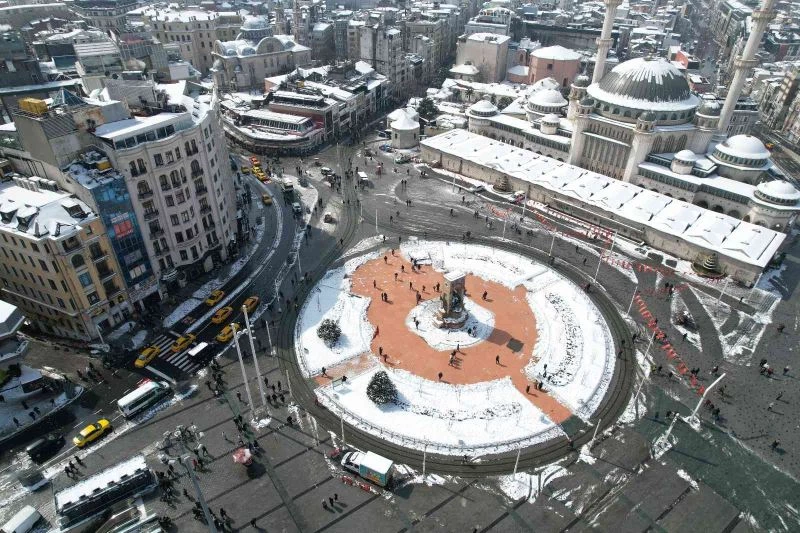 İstanbul’da günlerdir etkisini sürdüren kar yağışı nedeniyle kentin en işlek noktalarından biri olan Taksim Meydanı beyaza büründü. Beyaz örtü altındaki Taksim Meydanı ve İstiklal Caddesi havadan görüntülendi. Havadan çekilen görüntülerde Taksim Camii’nin kubbeleri ile binaların çatılarının yanı sıra meydan ve İstiklal Caddesi’nde beyaz örtünün hakim olduğu görüldü.