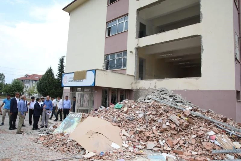 Düzce İl Özel İdaresi tarafından kent genelinde deprem gören, hasarlı olan, yenilemeye ihtiyaç duyulan okullarda yenileme ve güçlendirme çalışmaları başlatıldı. Birçok okulda devam eden çalışmaların yeni döneme yetiştirilmesi planlanıyor. Düzce Valisi Cevdet Atay ve kurum amirleri de bu yenileme ve güçlendirme çalışmalarını sürekli denetleyerek ekiplerin çalışmalarını inceliyor. Son olarak Düzce Valisi Cevdet Atay, beraberindeki heyet ile birlikte Beyköy’de bulunan ortaokuldaki güçlendirme çalışmalarını inceledi. Yapılan çalışmalar hakkında İl Milli Eğitim Müdürü Tamer Kırbaç’tan bilgiler alan Vali Atay, okul içi ve dışındaki çalışmaları da inceledi.