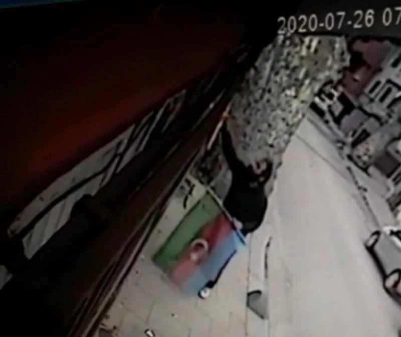 Beykoz’da kimliği belirlenemeyen bir kişi, iş yerinin kapısına asılan Azerbaycan ve Türk Bayrağını eline alarak yere fırlattı. Yoldan geçen küçük bir çocuğun yerdeki bayrakları alarak kenara koyması ve saldırı anı güvenlik kamerasına yansıdı.