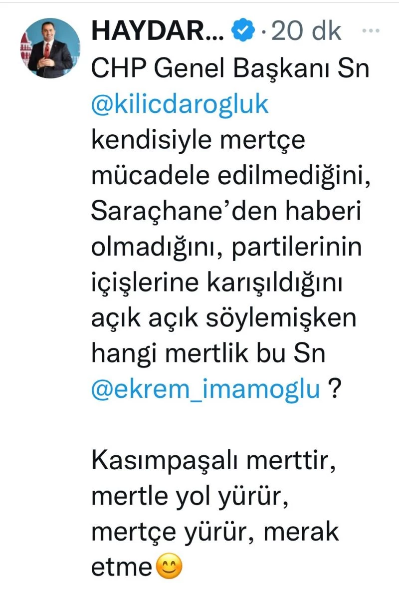 Sosyal medyadan İmamoğlu’na seslenen Yıldız, Kemal Kılıçdaroğlu’nun açıklamalarına dikkat çekti. “CHP Genel Başkanı Kemal Kılıçdaroğlu kendisiyle mertçe mücadele edilmediğini, Saraçhane’den haberi olmadığını, olanları sosyal medyadan öğrendiğini söylüyor” diyen Başkan Yıldız, “Partinizin genel başkanı içişlerine karışıldığını açık açık söylemişken hangi mertlik bu Sayın İmamoğlu?” diye sordu. Başkan Yıldız mesajını “Kasımpaşalı merttir, mertle yol yürür, mertçe yürür merak etme” notuyla tamamladı.