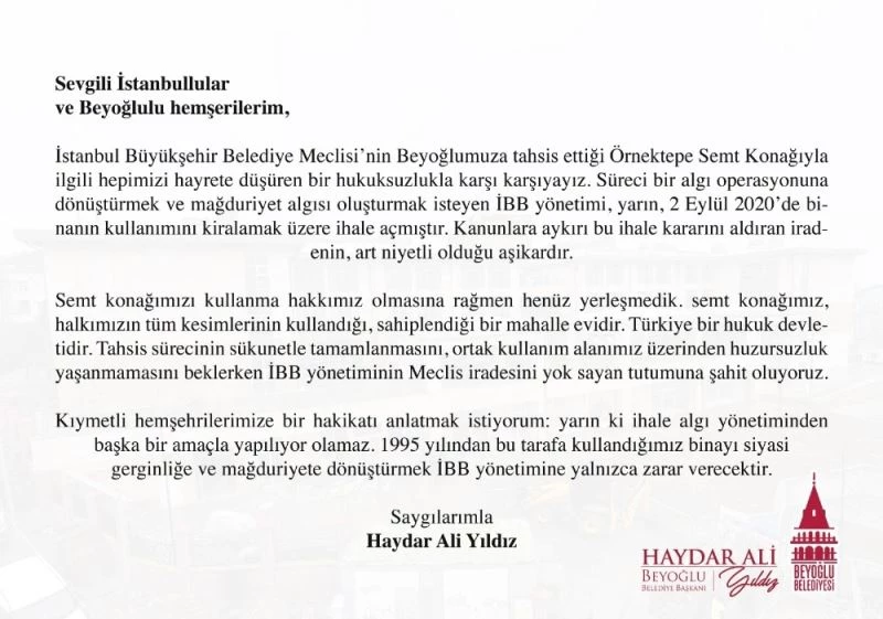 Beyoğlu Belediyesi, İBB meclisi tarafından kendilerine verilen Örnektepe Semt Konağı’nın, meclis kararına rağmen 3. bir şahsa kiralanmasıyla ilgili yazılı basın açıklaması yaptı. Açıklamada şu ifadelere yer verildi: