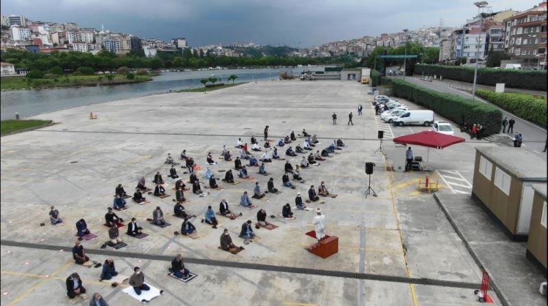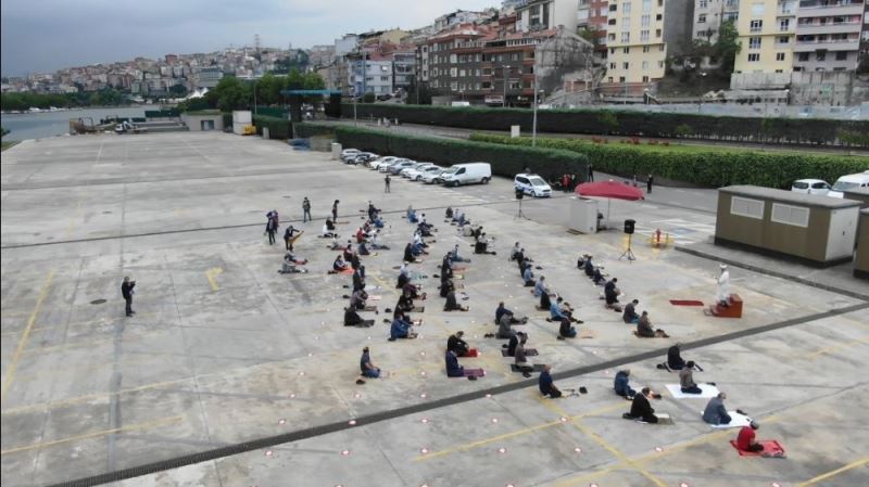 Yeni tip korona virüs (Covid-19) salgını tedbirleri kapsamında 16 Mart’ta toplu halde namaz kılınmasına kapatılan camiler bugün cuma namazı ile tekrar açıldı. Haliç Kongre Merkezi otoparkına gelen cemaat uzun bir aranın ardından cuma namazını kıldı. Kılınan cuma namazı havadan drone ile de görüntülenirken, Beyoğlu Haliç Polis Merkezi Amirliği ekipleri ise hoparlörlü drone ile “sosyal mesafe” uyarısında bulundu.