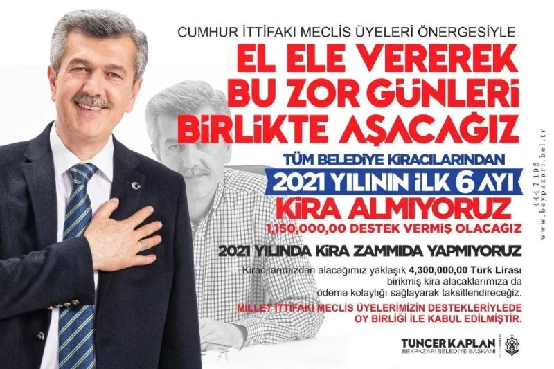 Yılın ilk 6 ayı iş kolu ayırt etmeksizin kira alınmaması kararı aldıklarını açıklayan Başkan Kaplan ”Yeni yılın ilk Belediye Meclis toplantısında Cumhur İttifakı Meclis üyelerimizin ‘Belediyemiz kiracılarından 2021 yılının ilk 6 ayında kira alınmaması ve 2021 yılı içerisinde kira zammı yapılmaması’ konusundaki sözlü önergesi Millet İttifakı Meclis üyelerinin de desteğiyle oy birliğiyle kabul edildi. İçinde bulunduğumuz bu zorlu süreçte kiracılarımıza 1 milyon 150 bin TL destek vermiş olacağız. 6 ay boyunca kiracı esnafımızdan iş kolu ayırt etmeksizin kira almayacağız. 2021 yılında kira zammı yapmayacağız. Kiracılarımızdan alacağımız yaklaşık 4 milyon 300 bin TL birikmiş kira alacağımızı da ödeme kolaylığı sağlayarak taksitlendireceğiz. Alınan kararlar için Meclis üyelerimize teşekkür ediyor, ilçe esnafımıza hayırlı olmasını diliyorum” ifadelerini kullandı.