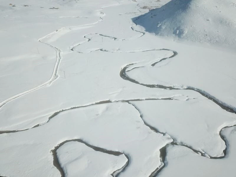Şırnak’ın Beytüşşebap ilçesinde eksi 30 derecede buz tutan dere yatakları, havaların ısınmasıyla çözüldü. Kar yığınları arasında yılan gibi kıvrılan dev menderesler, tüm ihtişamlığı ile havadan görüntülendi.