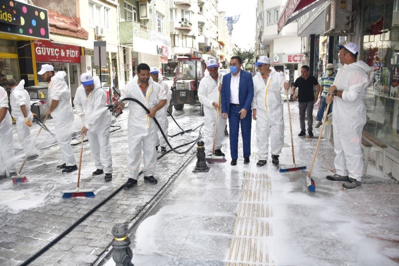 Biga Belediyesi ekipleri, Covid-19 ile mücadele kapsamında cadde ve sokakları deterjanlı su ile yıkayıp dezenfekte etti.