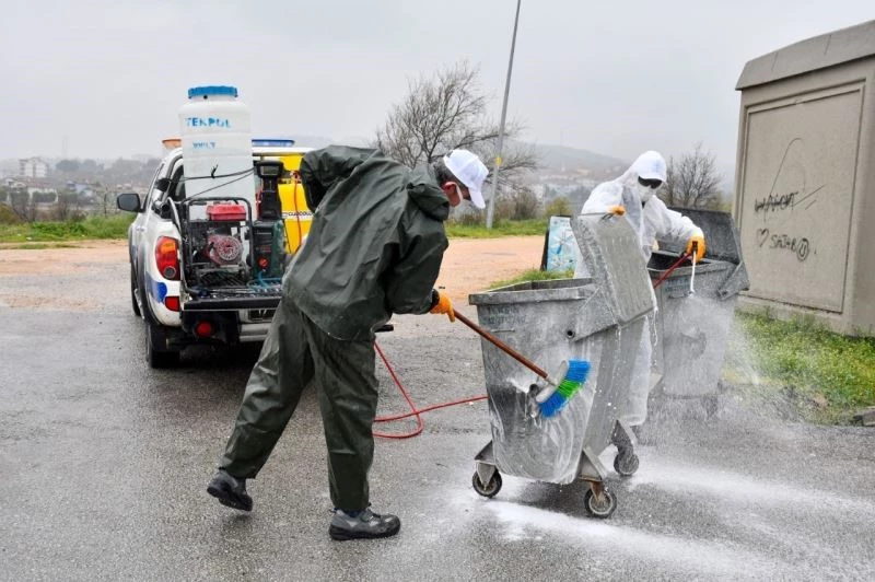 Çanakkale’nin Biga ilçesinde belediye ekipleri tarafından yaklaşık 2 bin 300 yeraltı ve yerüstü konteyner, özel kimyasallarla yıkanıp dezenfekte edilmeye başlandı.