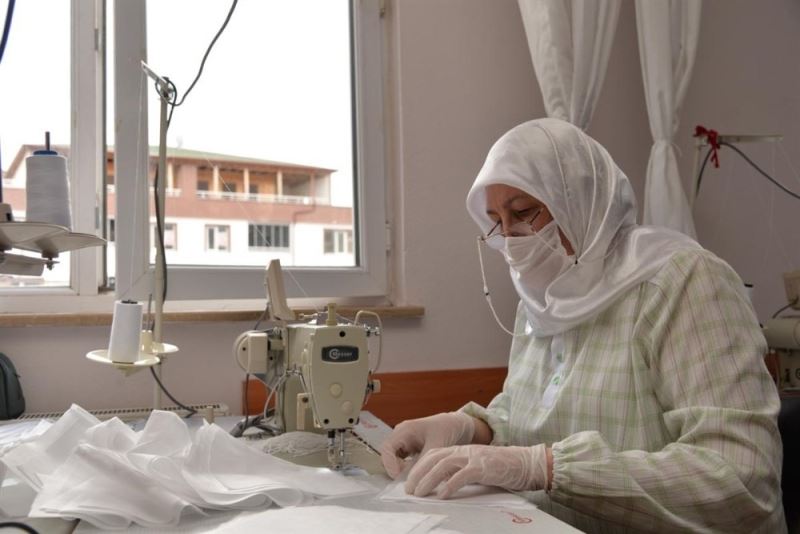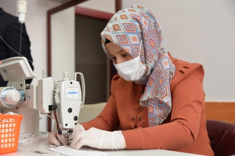 Bilecik Halk Eğitim Merkezinde Korona virüs (Covit-19) salgını ile mücadele kapsamında ’’eğitimden üretime’’ projesine destek veren kadınlar cerrahi maske üretiyor.