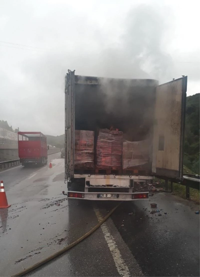 Bilecik’te lastiği patlayan çikolata ve bisküvi yüklü tırda çıkan yangın büyümeden söndürüldü.