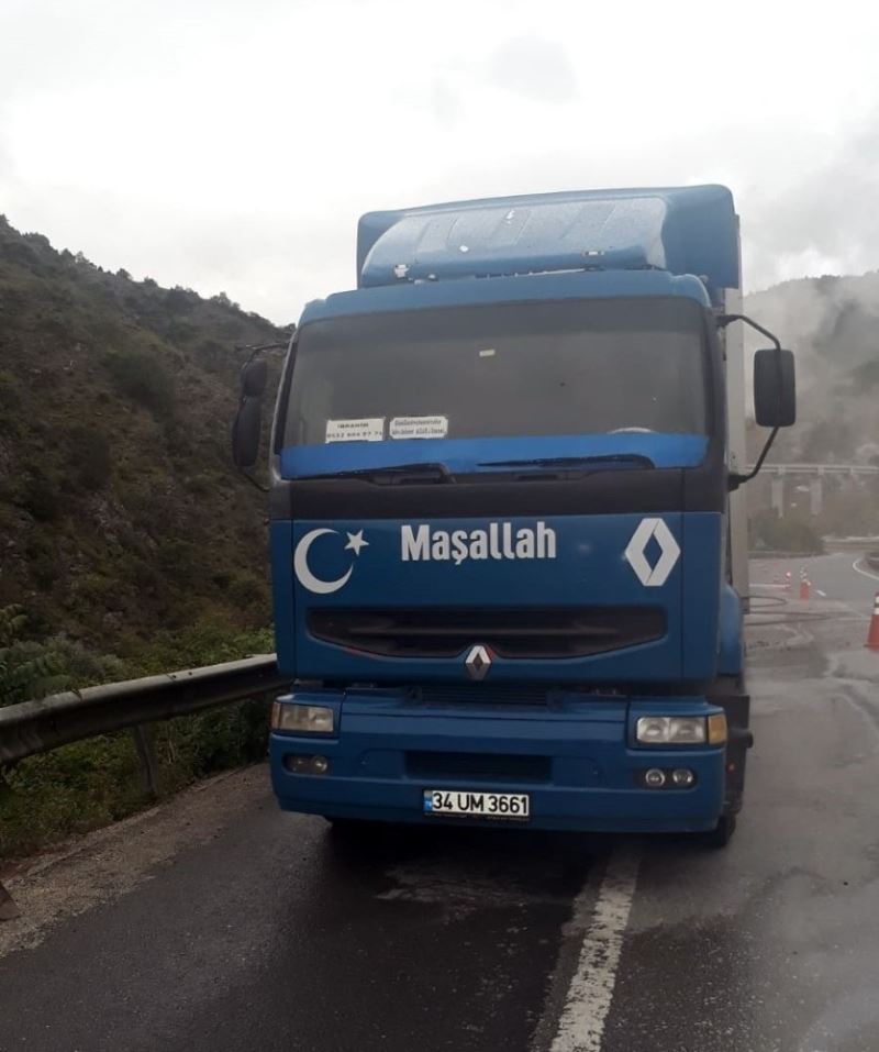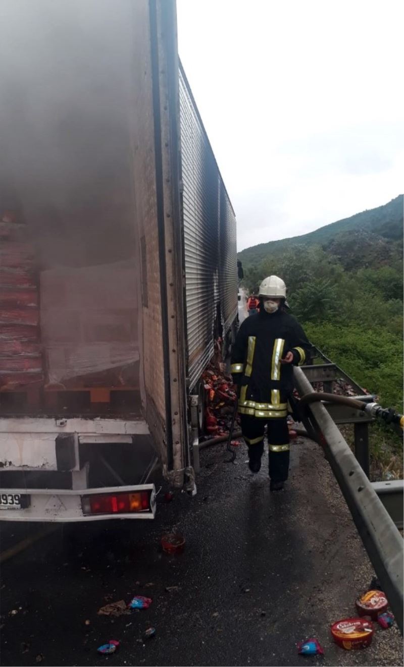 Bilecik’te çikolata yüklü tırın lastiği patlayınca yangın çıktı