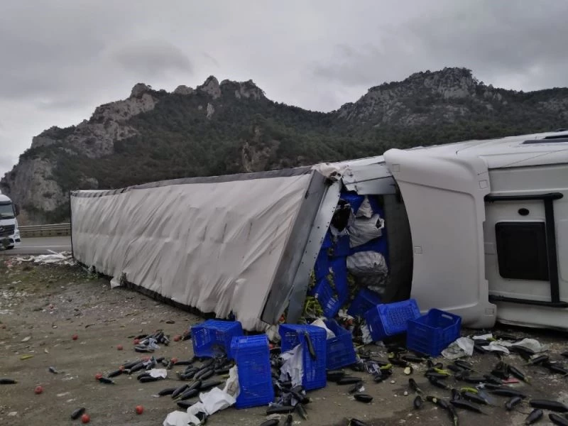 Bilecik’in Osmaneli ilçesinde sebze yüklü devrilen tırın sürücüsü yaralandı.
