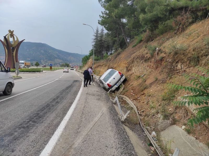 Bilecik’te kontrolden çıkan otomobil, bariyerlere çarparak yol kenarındaki su tahliye kanalına devrildi.