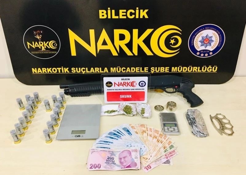 Bilecik İl Emniyet Müdürlüğü Narkotik Suçlarla Mücadele Şube Müdürlüğü tarafından uyuşturucu madde kullanan ve ticaretini yapan şahıs ve organizasyonların deşifresine yönelik olarak yapılan operasyon sonucu S.Y., M.U, Ç.Ç, ve O.Y. isimli şahısları gözaltına aldı. Şahıslardan 2,23 gram skunk maddesi, 1 adet pompalı tüfek, 19 adet dolu fişek, 2 adet hassas terazi, 1 adet muşta olarak tabir edilen kesici ve delici alet, 1 adet uyuşturucu madde öğütümünde kullanılan öğütücü, 25 adet ortalama aynı ebatlarda uyuşturucu madde satışında paketlemekte kullanıldığı değerlendirilen alüminyum folyo geçirilmiştir.