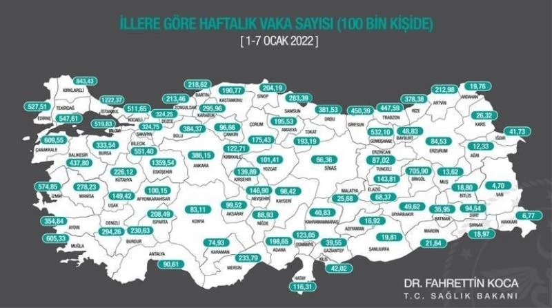 Sağlık Bakanı Fahrettin Koca, sosyal medya hesabından 1-7 Ocak kapsayan illere göre haftalık her 100 bin kişide vaka sayısı haritasını paylaştı. Tabloya göre Bilecik’te vaka sayısı her 100 bin kişide 551,40 olarak görüldü. Bu rakam 25-31 Aralık tarihleri arasında 356,17, 18-24 Aralık tarihleri arasında ise 286,67 olarak kayıtlara geçmişti.