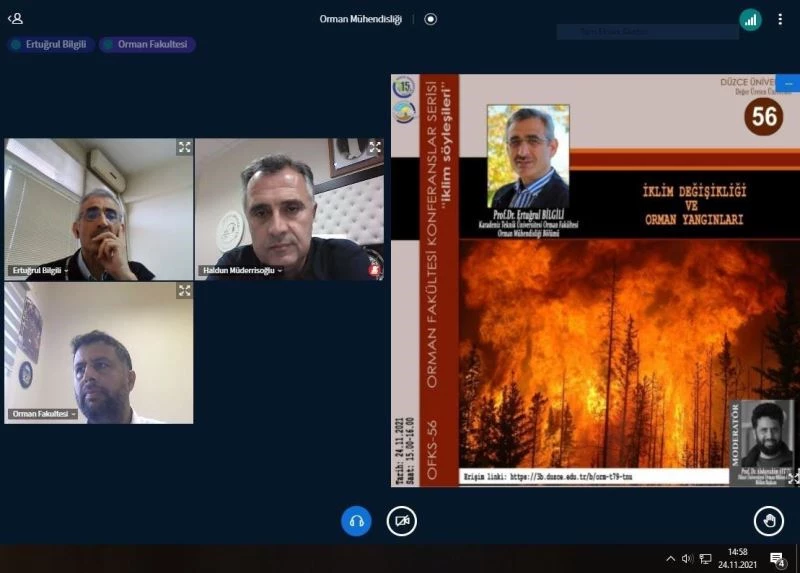 Düzce Üniversitesi Orman Fakültesi’nin hayata geçirdiği, Orman Fakültesi Konferanslar Serisi’nin 56. sayısında “İklim Değişikliği ve Orman Yangınları” konusu ele alındı. Çevrim içi olarak düzenlenen ve moderatörlüğünü Düzce Üniversitesi Orman Fakültesi Orman Mühendisliği Bölüm Başkanı Prof. Dr. Abdurrahim Aydın’ın yaptığı etkinlikte Karadeniz Teknik Üniversitesi Orman Fakültesi Orman Mühendisliği Bölümü Öğretim Üyesi Prof. Dr. Ertuğrul Bilgili, bilgi ve deneyimlerini katılımcılarla paylaştı.