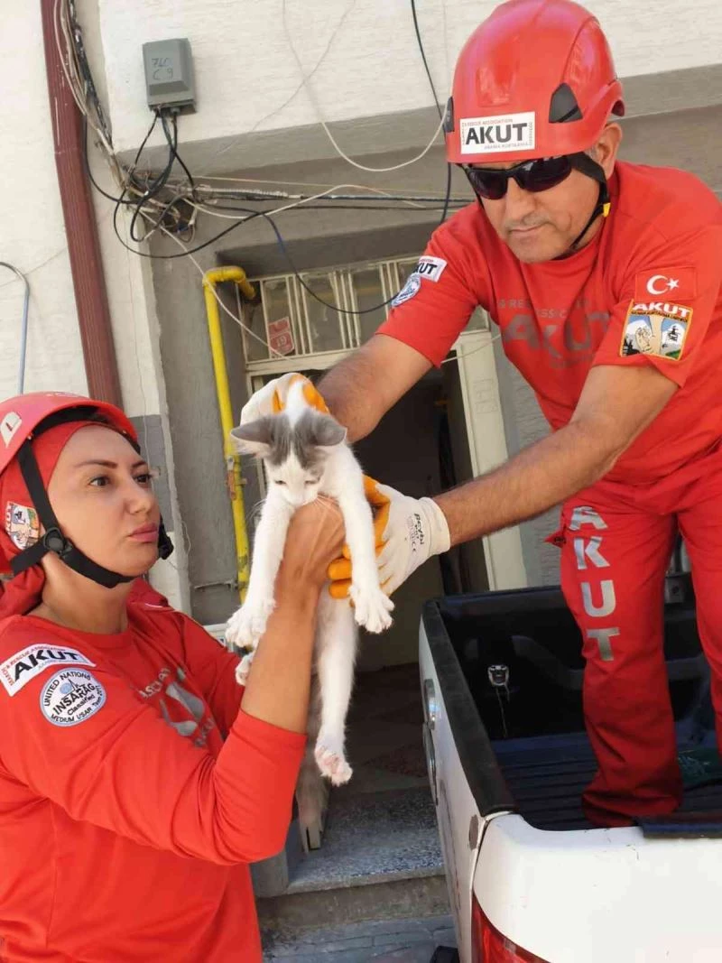 Binanın ikinci katında mahsur kalan kedi AKUT’un operasyonuyla kurtarıldı
