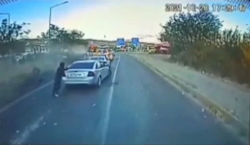 Kaza anı ise seyir halinde olan halk otobüsü kamerasına anbean yansıdı. Görüntüde, kontrolden çıkan aracın hızla yan yatarak ilerlediği ve ışıkta bekleyen araçlara çaptığı, bir yayanın ise aracın altında kalmaktan kıl payı kurtulduğu görüntülendi.