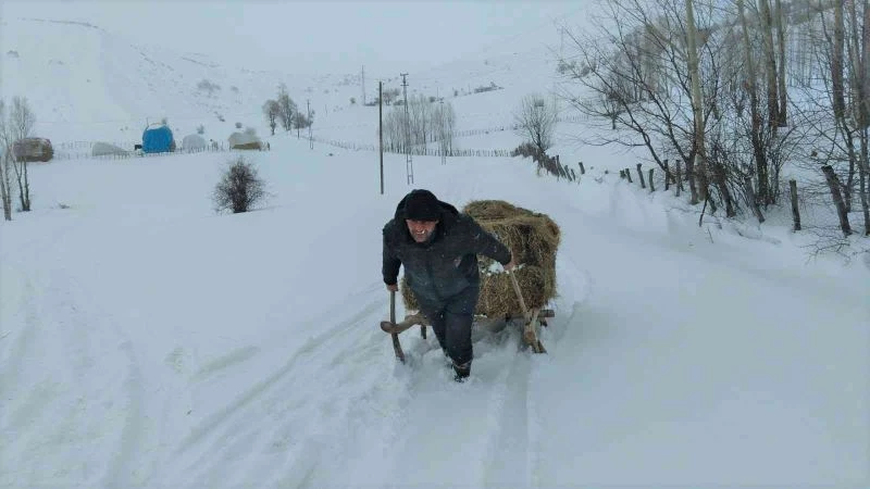 Bingöl’ün Karlıova ilçesinde çetin geçen kış aylarına rağmen besiciler, yaklaşık 2 kilometre boyunca kızaklarla taşıdığı otlarla hayvanlarını besliyor.