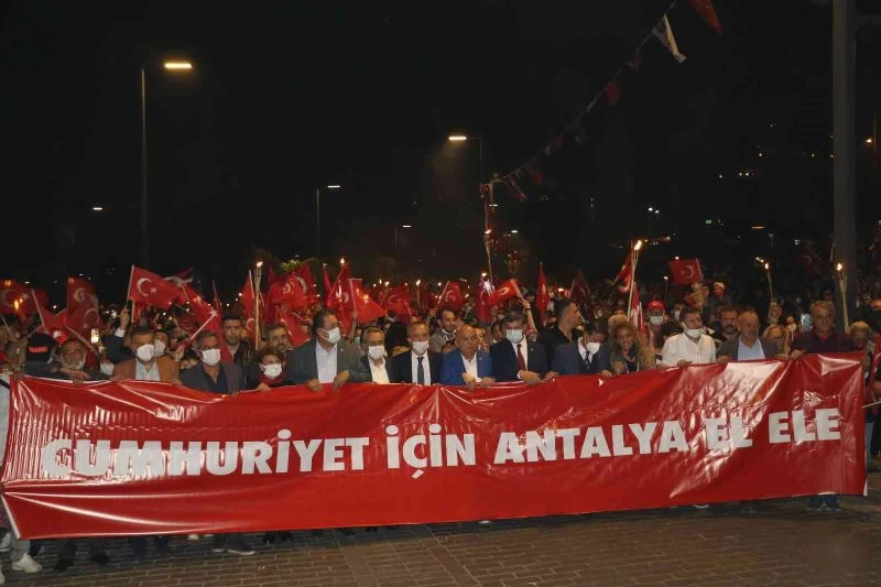 Cumhuriyet’in 98’inci yılı ülke genelinde farklı etkinliklerle kutlanmaya devam ediyor. Antalya’da da Büyükşehir Belediyesi ve Cumhuriyet İçin Antalya El Ele Platformu tarafından fener alayı düzenlendi. Yürüyüş Konyaaltı Caddesi üzerindeki varyanttan başladı. Yürüyüşe gelen binlerce vatandaş Türk bayraklarıyla görsel şölen oluşturdu.