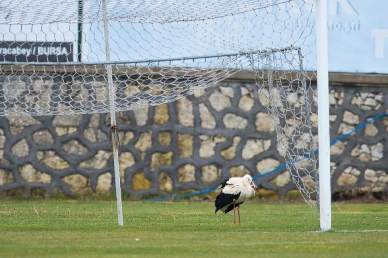 Karacabey Belediyespor’un maçlarını oynadığı ilçe stadyumunda kale direğinin yanı başında dinlenmeye koyulan leylek ilginç anlara sebep olurken, stad görevlileri leyleği rahatsız etmemek için o bölgeye yaklaşmamaya özen gösterdi. Yorgun leylek bir süre dinlendikten sonra stadyumdan ayrıldı.