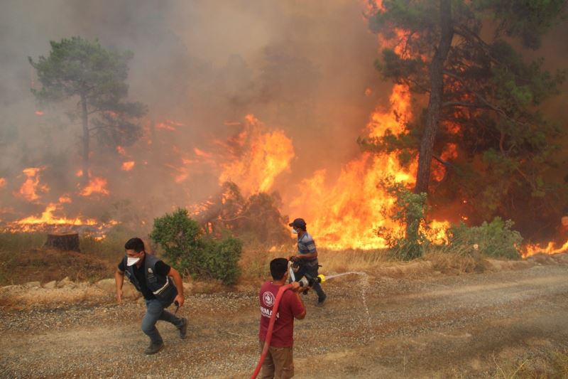 Manavgat ilçesinde 6 gün önce başlayan orman yangını ilerlemeye devam ediyor. Yangın ilk çıktığı noktadan yaklaşık 40 kilometre kuzeyde bulunan Beydiğin Mahallesi’ne kadar geldi. Bir dağın yamacına kurulu olan mahalle bir anda alevlerin arasında kaldı. Şiddetli rüzgarın etkisi ile büyüyen yangından çıkan alevler, metrelerce havaya yükseldi. Alevlerin mahalleyi sarmasının ardından bir yandan ekipler diğer taraftan mahalle sakinleri adeta seferber oldu. Ekipler evlerin içerisinde doğru ilerleyen yangına iş makineleri, arazözlerle müdahale eti. Evlerin sınırına kadar gelen alevleri ekipler güçlükle söndürdü. Vatandaşlar işe testereler ile etraftaki büyük ağaçları keserek alevlerin sıçramasını engellemeye çalıştı. Şiddetli rüzgar nedeniyle alevler sık sık yön değiştirdi. Alevlerin arasına giren vatandaşlar tehlikeye rağmen ellerindeki dal parçaları ile ateşi söndürmeye çalıştı. Yamaçtan yamaca sıçrayan alevleri söndürmek için vatandaşlar seferber oldu. Yaklaşık 1 saatlik çalışmanın ardından vatandaşlar ve ekiplerin alevlerin mahalleye girmesini güçlükle engelledi. Rüzgarın etkisiyle karşı yamaca atlayan yangın ilerleyerek etkisini devam ettiriyor. Yangında bir kişi de dumandan etkilenerek, hastaneye kaldırıldı.