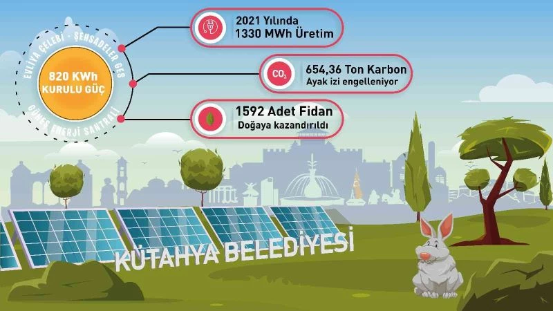 Yapılan açıklamada, "Yenilenebilir enerji kaynaklarının her geçen gün önem kazandığı günümüzde Kütahya Belediyesi bünyesinde kurulu bulunan iki güneş enerji santrali ile daha temiz bir çevre ve enerji kaynaklarının daha verimli kullanılması hedefleniyor. Toplam 820 KWh kurulu güce sahip Evliya Çelebi ve Şehzadeler GES’de 2021 yılında 1330 MWh elektrik üretimi gerçekleştirildi. Gerçekleşen bu üretim ile 654,36 ton karbon ayak izi engellenmiş oldu. 2021 yılında üretilen 1330 KWh ile bin 592 adet fidan doğaya kazandırıldı" denildi.