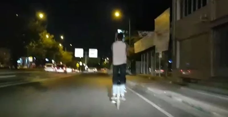 Bursa’da bir gencin bisikleti sürerken diğerinin de bisikletin arkasına geçerek ayakta yaptığı tehlikeli yolculuk, saniye saniye kaydedildi.