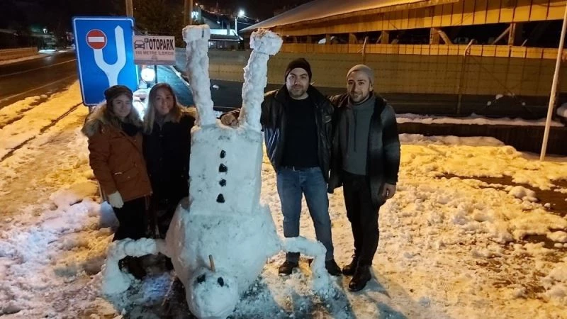 Tersten yapılan kardan adamı gören vatandaşlar, kardan adamın yanında durarak fotoğraf çektirdi.
