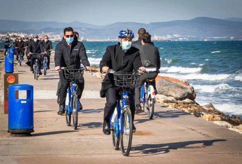 İzmir Büyükşehir Belediye Başkanı Tunç Soyer, Güzelbahçe’de Uğur Mumcu Anıtı, Ahmet Piriştina Rekreasyon Alanı ve Güzelbahçe Liman’a yerleştirilen BİSİM istasyonlarının açılışını yaptı. Hizmete giren noktalarla birlikte 55 istasyona ulaşıldığını belirten Başkan Soyer, “Temel hedefimiz, bisikletin İzmir genelinde ulaşım amacıyla kullanımının yaygınlaşmasını sağlamak” dedi.