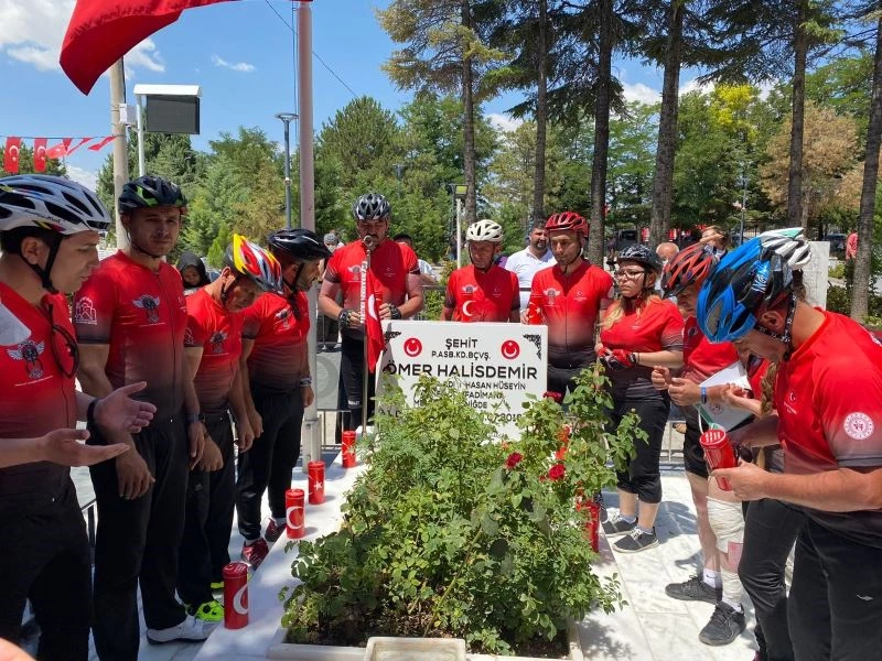 Çankırı 18 Vites Bisiklet ve Doğa Sporları Kulübü üyesi 11 sporcu, Çankırılı 11 şehidin mezarından toprak alıp, bisikletleriyle Niğde’ye geldi.