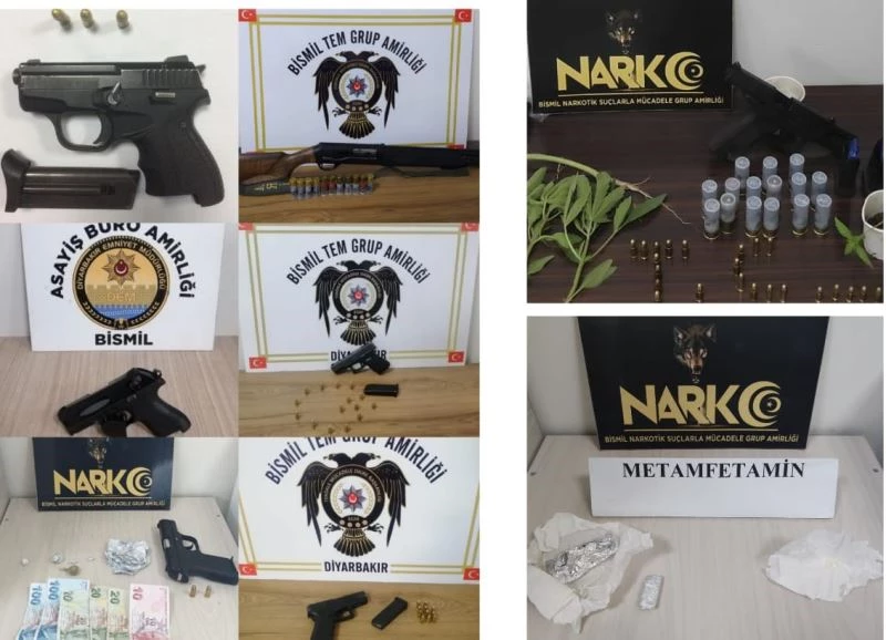 Bismil İlçe Emniyet Müdürlüğü ekiplerinin huzur uygulamasında haklarında yakalama kararı bulunan 2 şahıs yakalanırken, 1 adet ruhsatsız av tüfeği, 6 adet ruhsatsız tabanca, 49 adet fişek, 9 paket halinde toplam 26,66 gram metamfetamin maddesi, 2 kök kenevir bitkisi, 1 paket halinde 1,95 gram toz esrar maddesi ele geçirildi. Uygulamada gözaltına alınan toplam 12 kişi, gerekli işlemler için Bismil İlçe Emniyet Müdürlüğüne götürüldü.