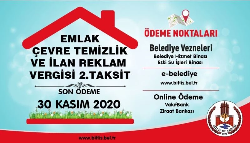Bitlis Belediyesi, 2020 yılı emlak, çevre temizlik ve ilan reklam vergisinin 2’nci taksit ödemelerinin 30 Kasım Pazartesi günü olduğu duyurdu.