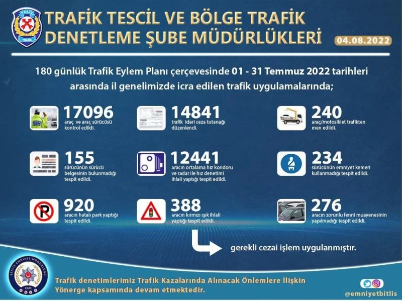 Bitlis Emniyet Müdürlüğü Trafik Tescil ve Bölge Trafik Denetleme Şube Müdürlüğü, 1-31 Temmuz tarihleri arasında düzenlenen trafik uygulama verilerini paylaştı.