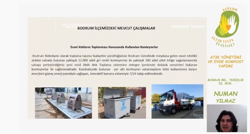 Bodrum Altın Eller Festivali kapsamında gerçekleşen ’Yerelde Sürdürülebilirlik ve Yaşam konulu’ ilk online buluşmada alanında uzman kişiler katılımcılarla buluştu. Bodrum Belediyesi Temizlik İşleri Müdürlüğü personeli Elektrik Elektronik Mühendisi Ufuk Eryılmaz ile Çevre Mühendisi Numan Yılmaz’ın da konuşmacı olarak yer aldığı buluşma, Bodrum Altın Eller Festivali internet sitesi ve sosyal medya hesaplarından canlı yayınlandı.