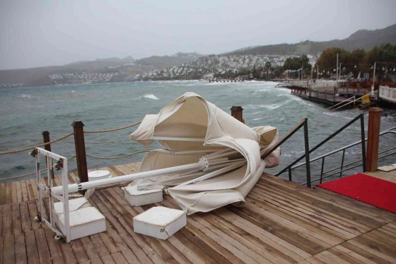 Muğla’nın Bodrum ilçesinde hızı 80 kilometreye kadar ulaşan fırtınada ağaçlar yıkıldı, direkler devrildi, elektrik telleri koptu.