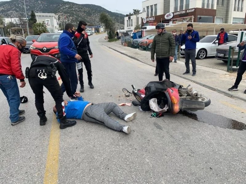 Muğla’nın Bodrum ilçesinde yola aniden önüne çıkan araca çarpan motosikletin sürücüsü yaralandı.