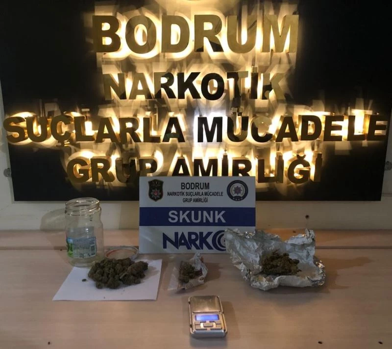 Edinilen bilgiye göre, Bodrum Narkotik Suçlarla Mücadele Grup Amirliği ekiplerince yapılan çalışma sonucu uyuşturucu madde ticareti yaptığı bilgisi alınan U.A. isimli şahsın üzerinde ve ikametinde yapılan aramada 3 parça halinde 45 gr Skunk, 1 adet hassas terazi ele geçirildi. Gözaltına alınan U.A işlemlerinin ardından adli makamlara sevk edildi.