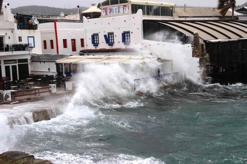 Muğla’nın Bodrum ilçesinde sabah saatlerinde başlayan lodos nedeniyle dev dalgalar sahilleri dövdü. Meteoroloji kırmızı kod uyarısı verirken, fırtına saate 80 kilometre hıza çıktı.