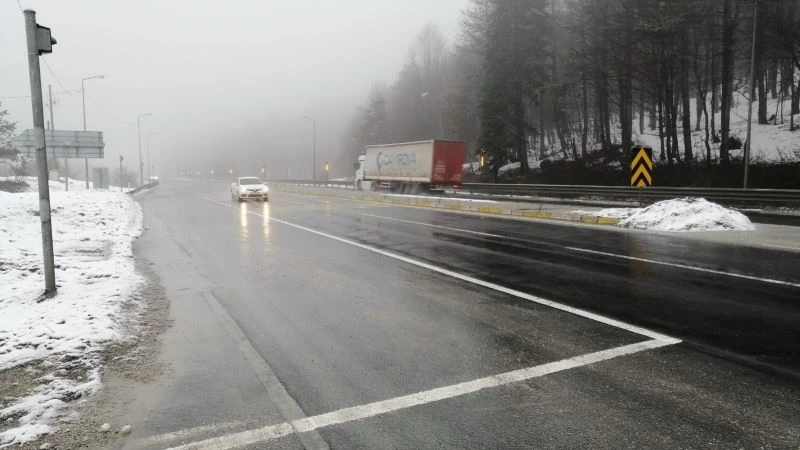 Bolu’da D-100 Karayolu Bolu Dağı geçişinde dün başlayan kar yağışı hafif şekilde etkisini sürdürürken, sis sebebiyle görüş mesafesi yer yer 30 metreye kadar düştü.