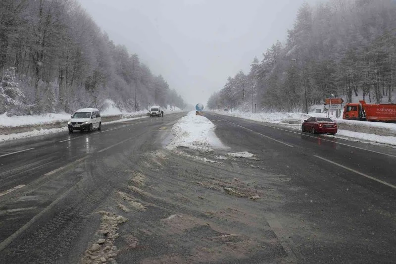 Karayolları ekipleri Bolu Dağı güzergahında kar küreme ve tuzlama çalışmalarını aralıksız olarak sürdürüyor. Sürücüler takip mesafelerini korumaları ve hız yapmamaları konusunda ışıklı tabelalar ve polis ekipleri tarafından uyarılıyor.