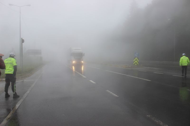 Yoğun sis ve yağmur nedeniyle görüş mesafesinin yer yer 10 metreye kadar düştüğü Bolu Dağı’nda göz gözü görmüyor.
