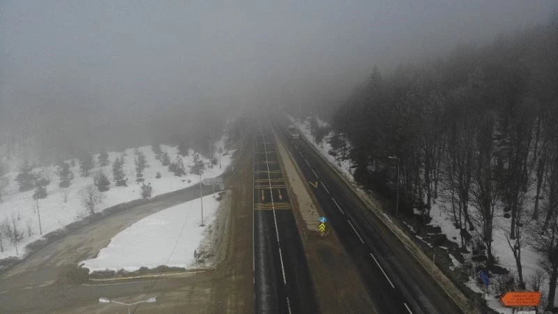 Bolu Dağı D-100 Karayolu kesiminde etkili olan ve görüş mesafesini yer yer 20 metreye kadar düşüren yoğun sis havadan görüntülendi.
