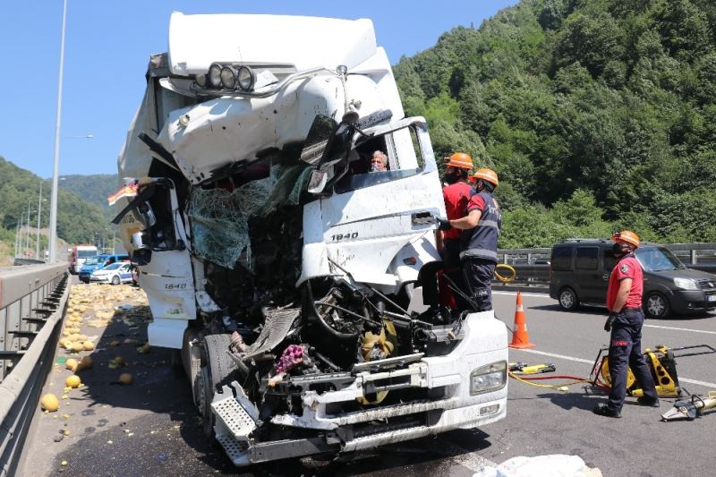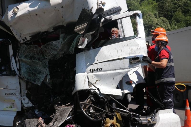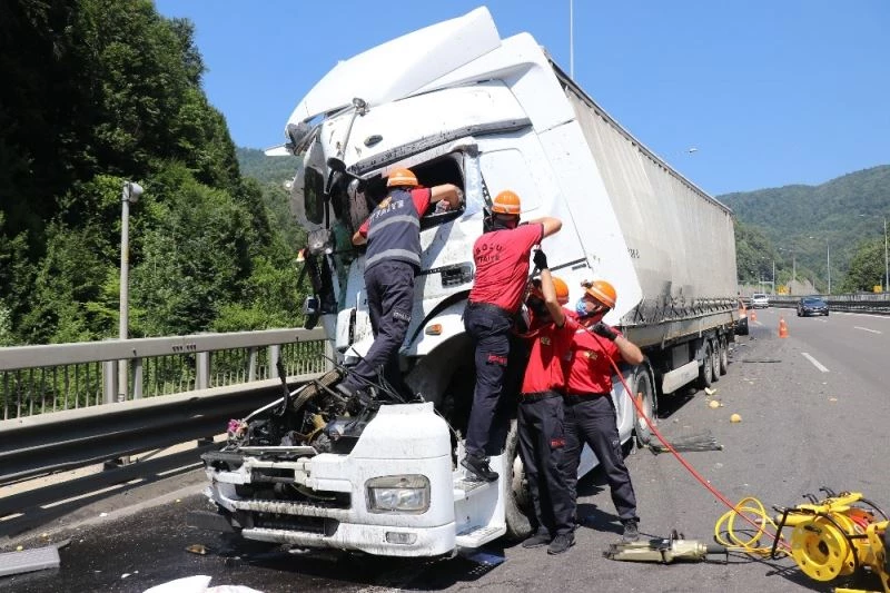 Bolu’da TEM Otoyolu’nda önünde ilerleyen kamyona çarpan tırın sürücüsü sıkıştığı yerden itfaiye ekiplerinin yarım saatlik çalışması sonucu kurtarıldı.