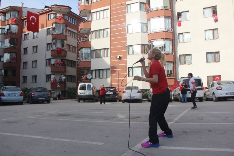 Bolu’da evde kalan site sakinleri müzik eşliğinde spor yaptı