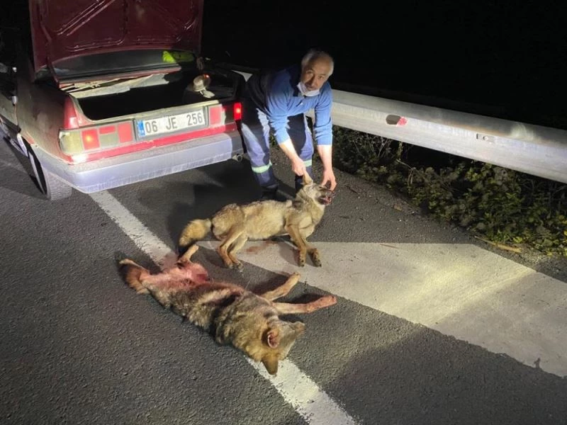 Bolu’da yolun karşısına geçmeye çalışan 2 kurt, seyir halindeki kamyonun çarpması sonucu telef oldu. Kurtlar kazaya sebep olmaması için bir vatandaş tarafından yoldan kaldırıldı.