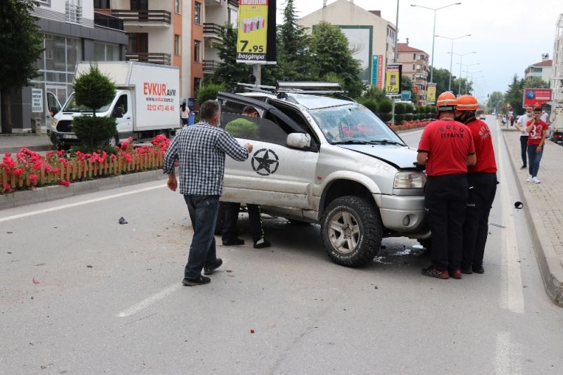 Kaza, saat 12.00 sıralarında Bahçelievler Mahallesi’nde meydana geldi. Edinilen bilgiye göre, Atatürk Bulvarı üzerinde seyir halinde olan Gürkan Öztürk idaresindeki 34 SIR 79 plakalı cip ile Ahmet Melih Tarımtörü yönetimindeki 14 EE 601 plakalı otomobil Konuralp Caddesi Kavşağı’nda çarpıştı. Çarpışmanın etkisiyle orta refüje çıkarak takla atan cipin sürücüsü Gürkan Öztürk yaralandı.