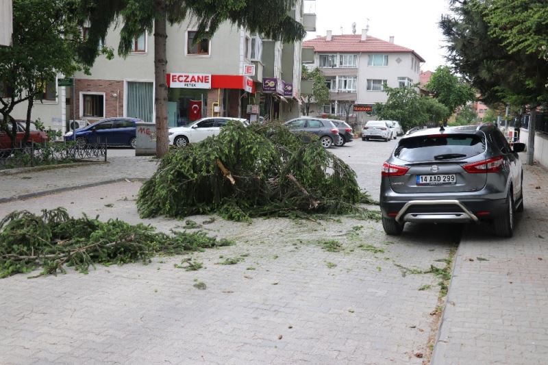 Bolu’da, şiddetli rüzgar 15 metrelik ağacın üst kısmını yola devirdi