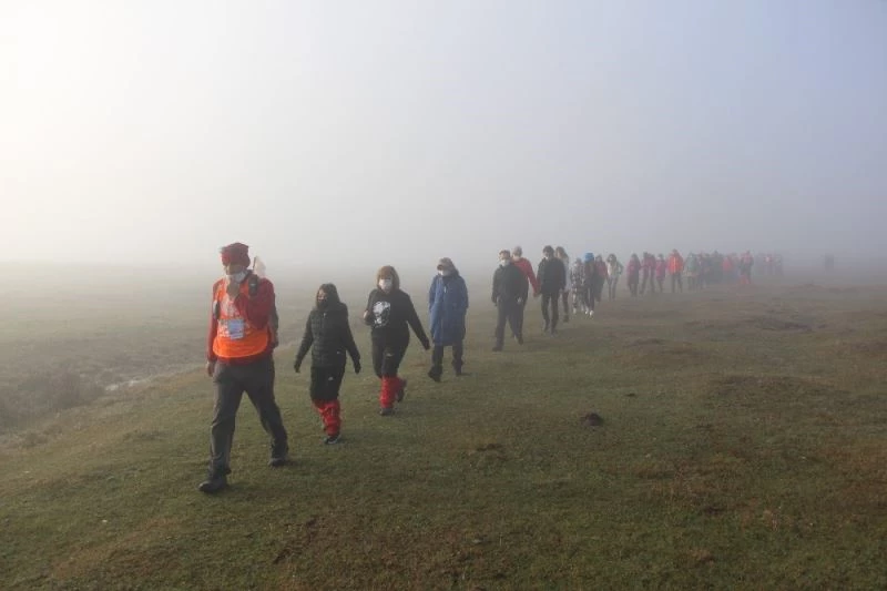 Sonsuzluk yürüyüşüne katılan grup, soğuk hava ve sis nedeniyle görüş mesafesinin yaklaşık 10 metreye kadar düştüğü yaylada zorlu 8 kilometrelik parkurda yürüyerek Atatürk’ü andılar.