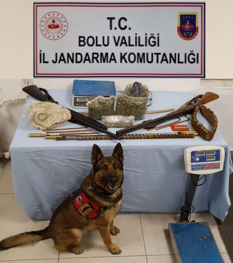 Edinilen bilgiye göre, Bolu’nun Kıbrısıcık ilçesinde bir evde uyuşturucu madde ve tarihi eser bulundurulduğu ihbarı üzerine İl Jandarma Komutanlığı ekipleri çalışma başlattı. Uyuşturucu arama köpekleriyle şüpheli eve operasyon düzenleyen ekipler, yaptıkları aramalarda 1 kilo 200 gram esrar, 2 adet hassas terazi, 2 adet ruhsatsız av tüfeği ve 1 adet tarihi eser ele geçirdi.