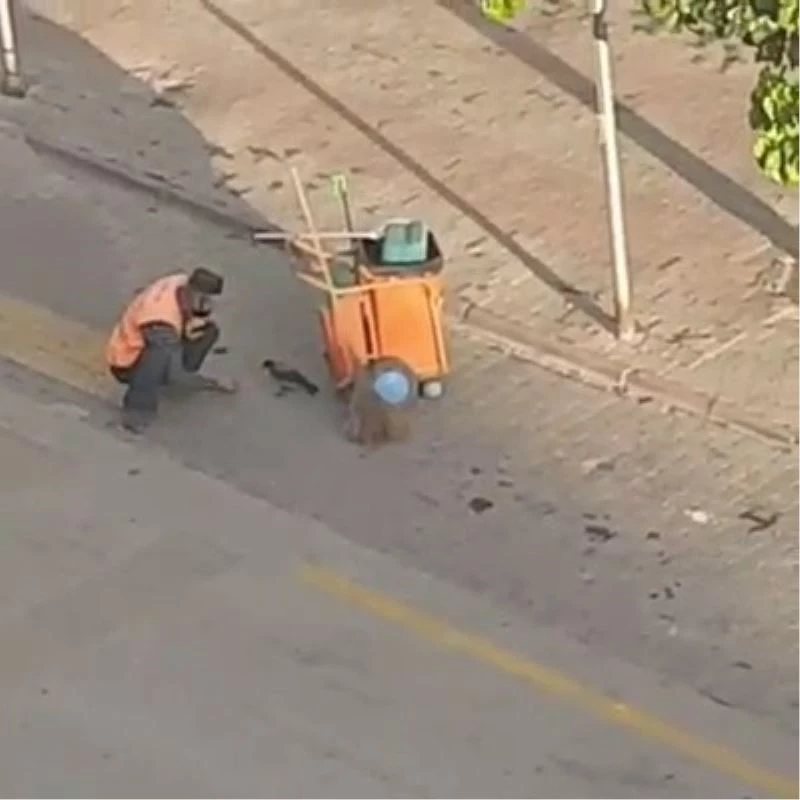 Bolu’da, belediye temizlik işçisini çöp topladığı sırada yanına gelen kargayı elleriyle beslemesi bir vatandaş tarafından cep telefonuyla görüntülendi.